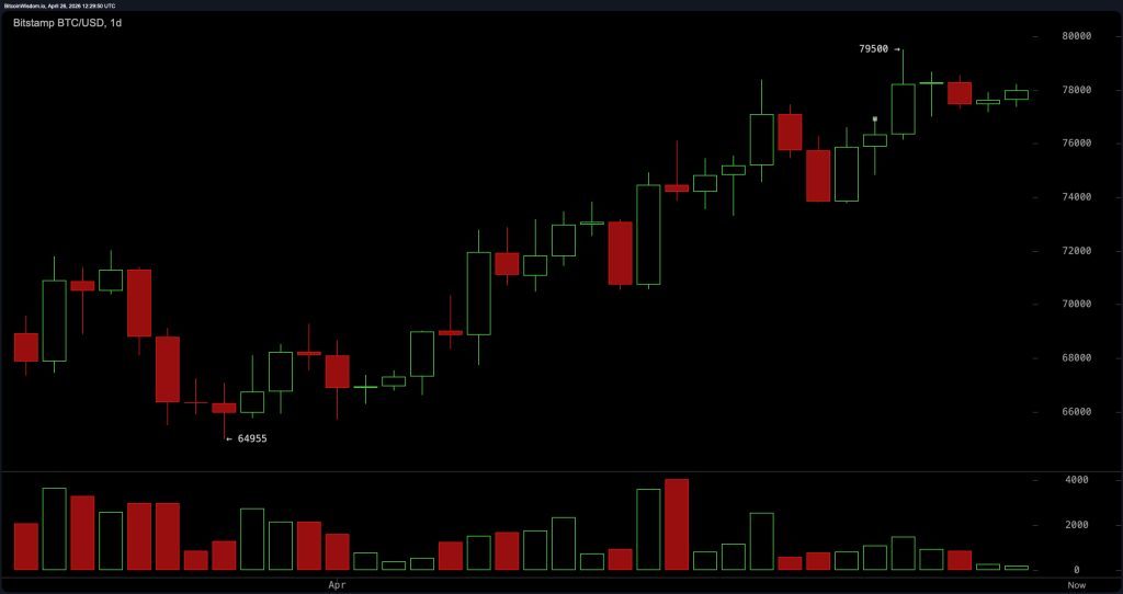 The daily bitcoin chart retains a bullish macro structure, marked by higher highs and higher lows from roughly $65,000 to $79,500. However, bitcoin is consolidating near highs as volume declines on the latest upward move, indicating that momentum is slowing rather than accelerating. Resistance remains firm at $79,500, while support is layered around $75,000 and $73,500, preserving the broader uptrend but hinting at potential pause or retracement.