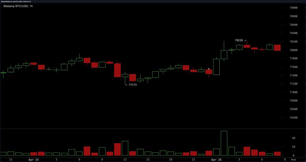 The 1-hour bitcoin chart shows tight consolidation, with local resistance between $78,200 and $78,500 and support between $77,200 and $77,400.