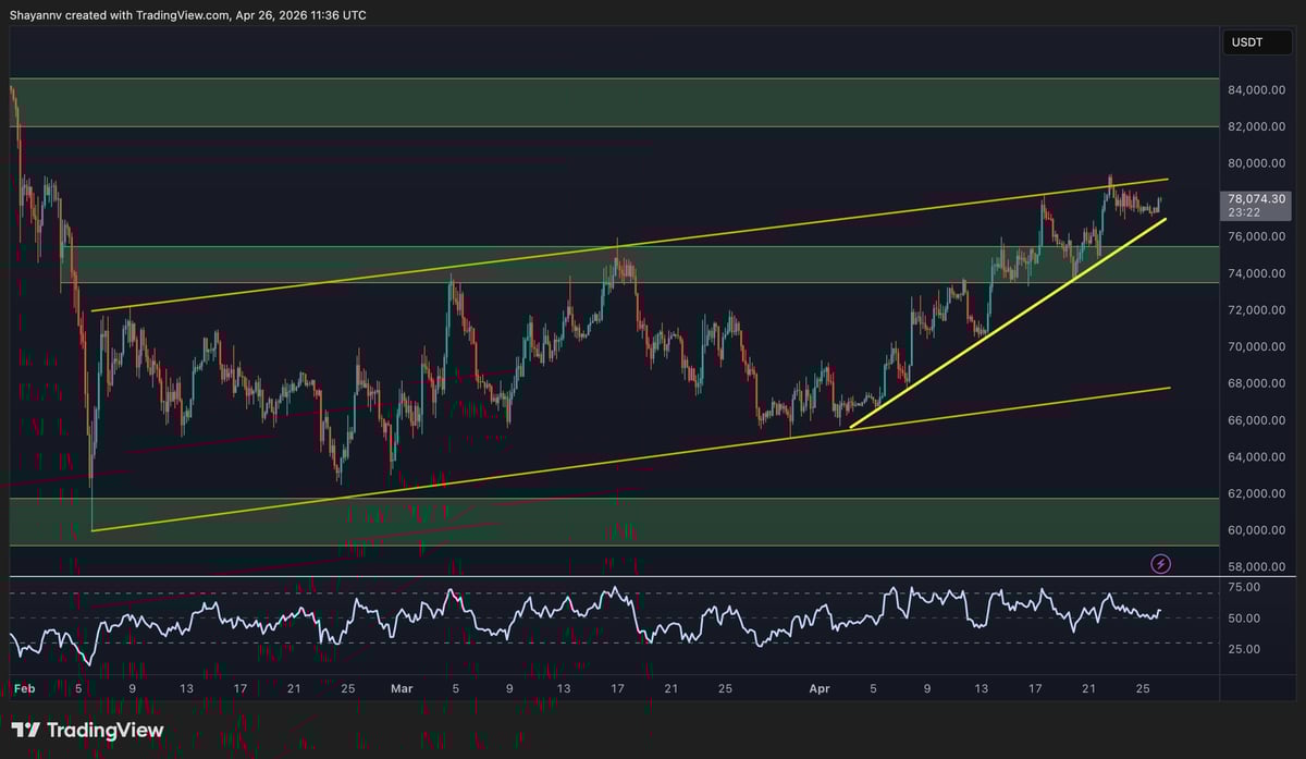 The 4-hour chart has developed an interesting two-layer structure. The broader ascending channel from the February lows frames the overall recovery, while a steeper short-term trendline that emerged in early April has acted as the actual engine of the recent push, driving price from around $68k all the way to current levels near $78k in three weeks.