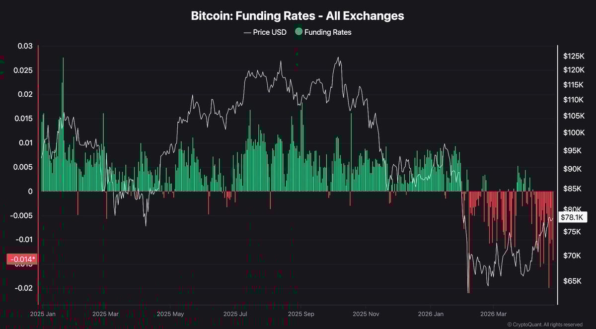 Sentiment-wise, there is a paradox that the funding rate chart presents. Despite $BTC trading at $78k, which is its highest level since February, funding rates across all exchanges remain firmly negative, currently reading around -0.014. The red bar dominance that began in February has not resolved, even as the price has rallied more than 20% from the lows. Traders are still paying to hold short positions at levels that are approaching two-month highs.