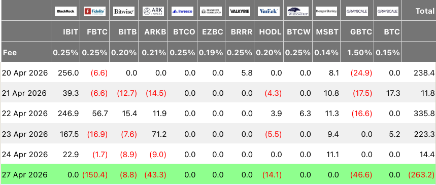 Bitcoin ETFs saw $263 million in net outflows on Monday, marking the first outflows since mid-April, according to SoSoValue data.