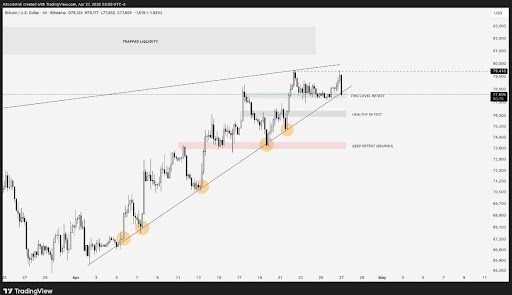 According to him, this ascending trendline has guided Bitcoin’s price action since it reached $65,000 in early April. The chart also clearly shows that every major swing high within $BTC’s latest recovery has respected this trendline, making it a consistently tested support area throughout the upward move.