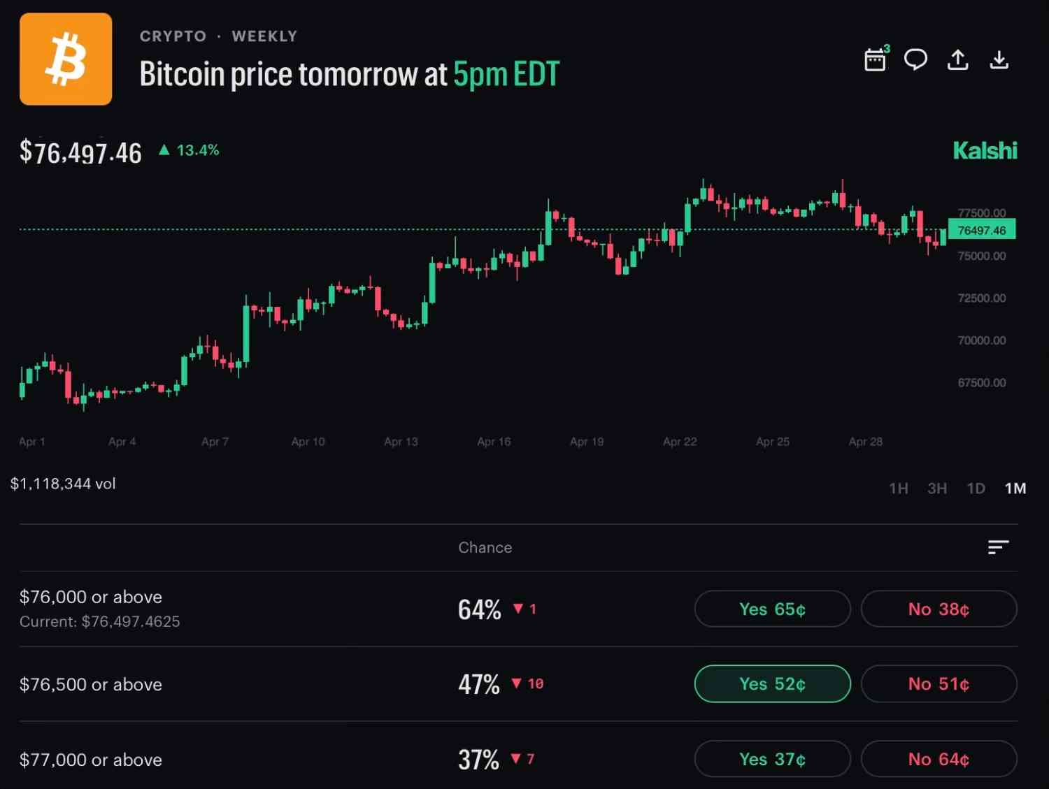 Bitcoin ($BTC) is up roughly 13% in April, and online prediction markets suggest that traders are counting on relatively stable prices as we head into May.