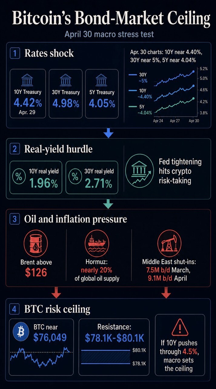 Bitcoin's April rebound is now facing a two-front macro test. The official Treasury curve for Apr. 29 placed the 10-year yield at 4.42%, the 30-year at 4.98%, and the 5-year at 4.05%.
