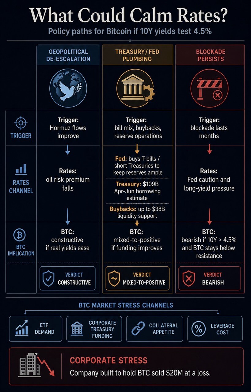 The market question is direct: if bonds keep selling off, does Washington need to reduce geopolitical oil pressure or ease Treasury and Fed plumbing before Bitcoin can retake risk appetite?