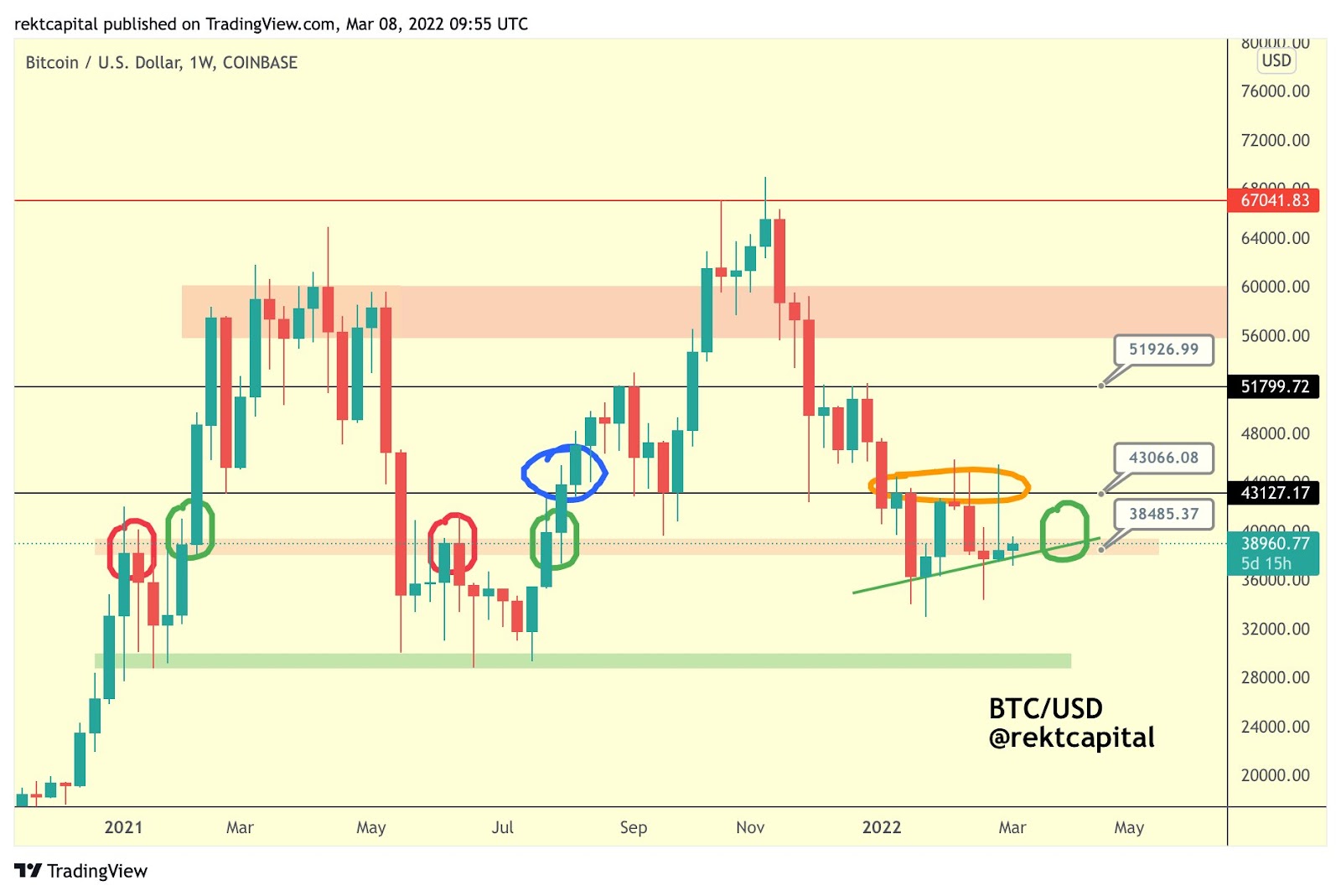Another leading crypto analyst, Rekt, has also addressed the recent developments, explaining that Bitcoin seems to be trying to retest at around $38,000 as it did previously in August 2021, and earlier in February 2021 (marked in green circles).