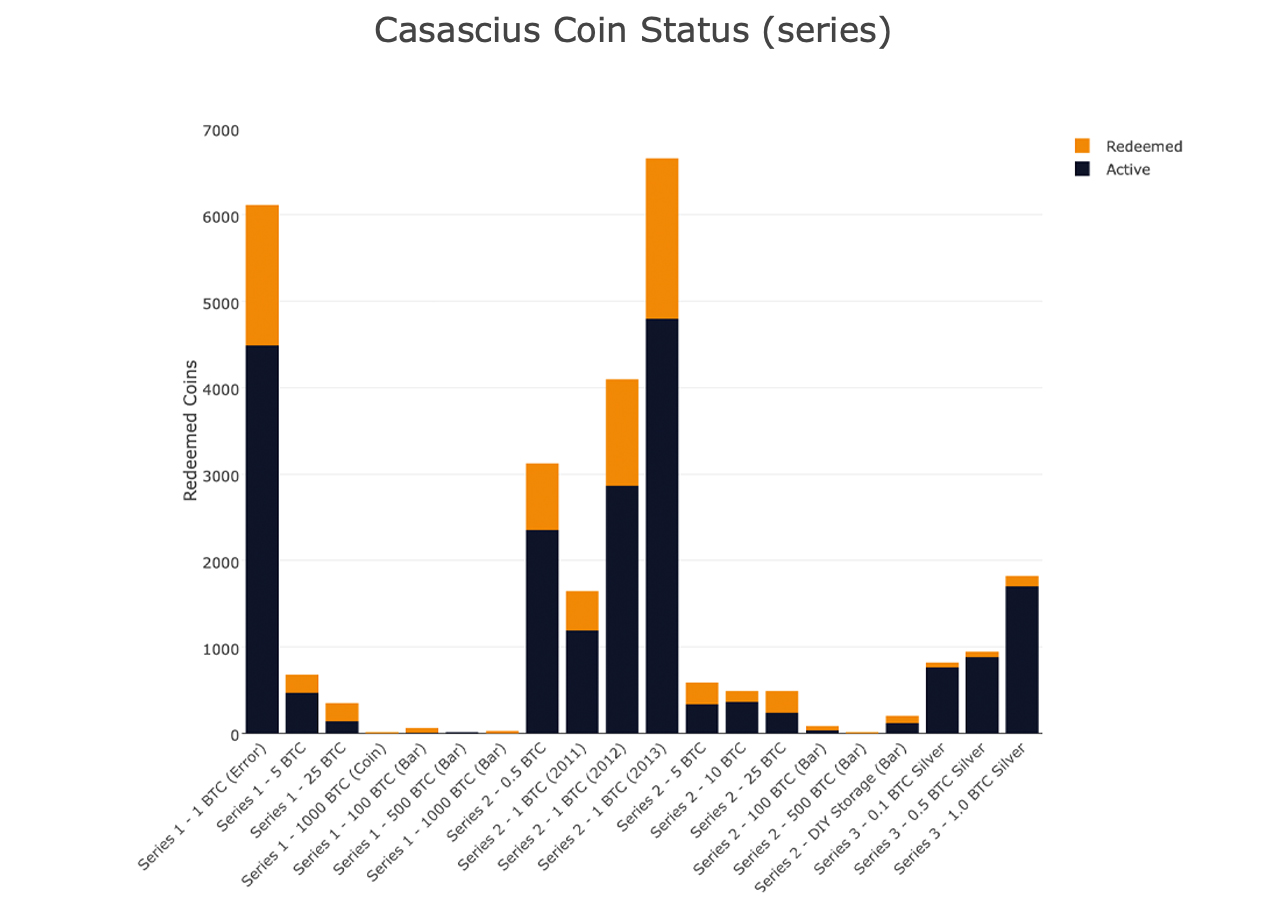 At the time of publication, 20,686 Casascius physical bitcoins are still left active and there is only one series that has been fully redeemed. The series 2 Casascius 500 BTC bars have all been redeemed, but there was only one 500 BTC bar made and it’s worth $9.5 million today.