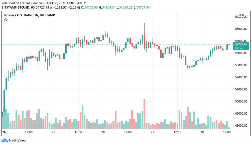 At the time of writing, BTC/USD traded at around $54,700, having come full circle over the past 24 hours which included a drop below $53,000.
