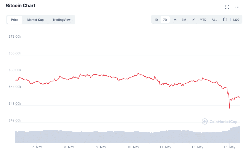 Even though Musk said that Tesla would not be selling any of its Bitcoin holdings, the price of BTC reacted almost immediately to the tweet, dropping nearly 20 per cent from roughly $58K to $49K. By press time, the price had recovered to $51,220.
