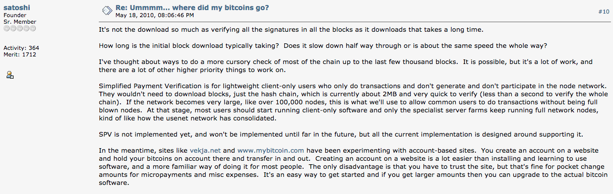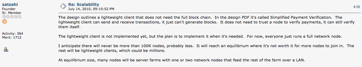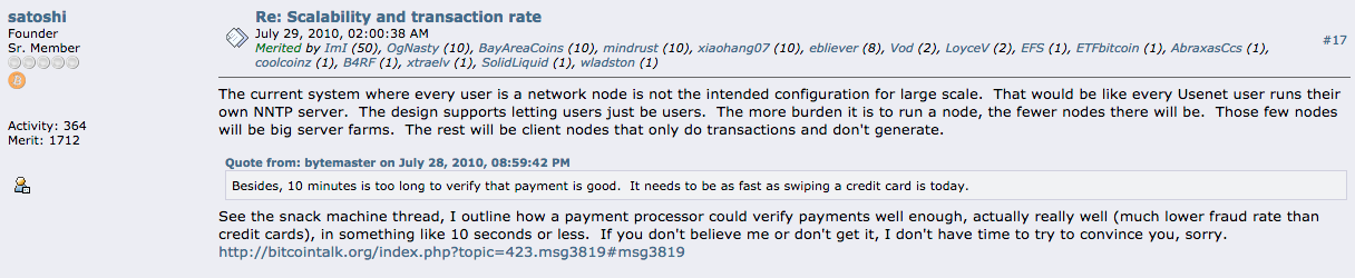 Another post on Bitcointalk that is important for Satoshi’s participation, is one on a thread from July 2010 titled ‘Scalability and transaction rate, where a user asks if a bottle neck could take place when the network grows. A few different Bitcointalk members tried to break it down, but he was still on denial, believing that bit-banks were required in the network to guarantee trust.