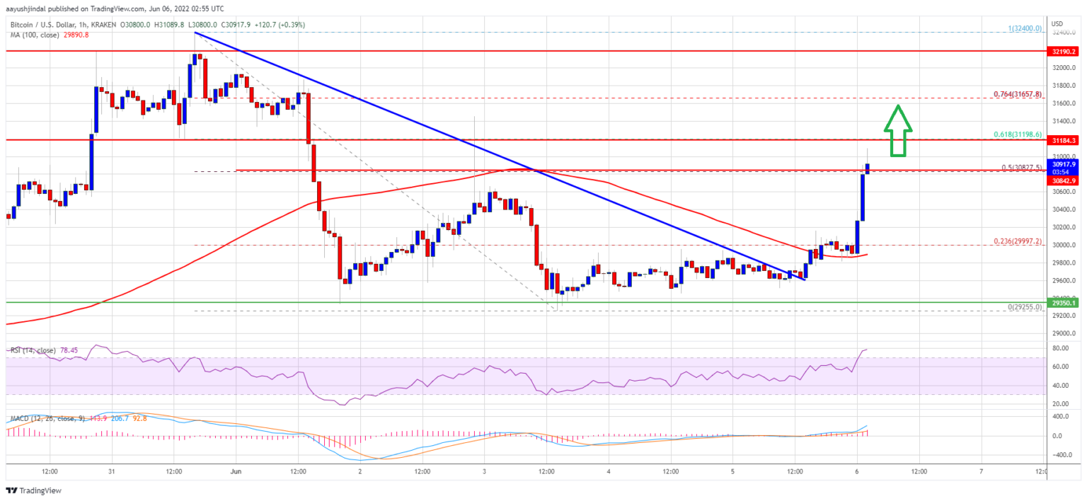 - The price is now trading above the $30,000 level and the 100 hourly simple moving average.