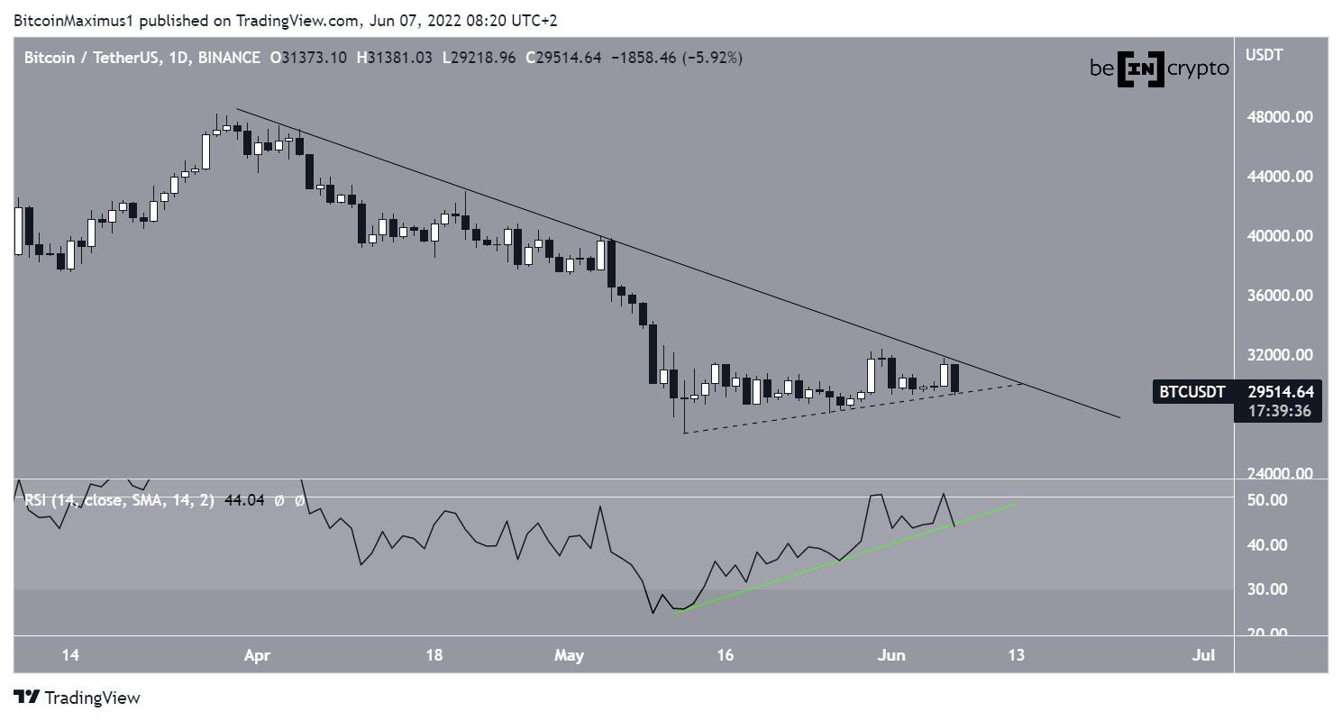 BTC has been falling underneath a descending resistance line since April 5. The line has caused numerous rejections which eventually led to the May 12 low.
