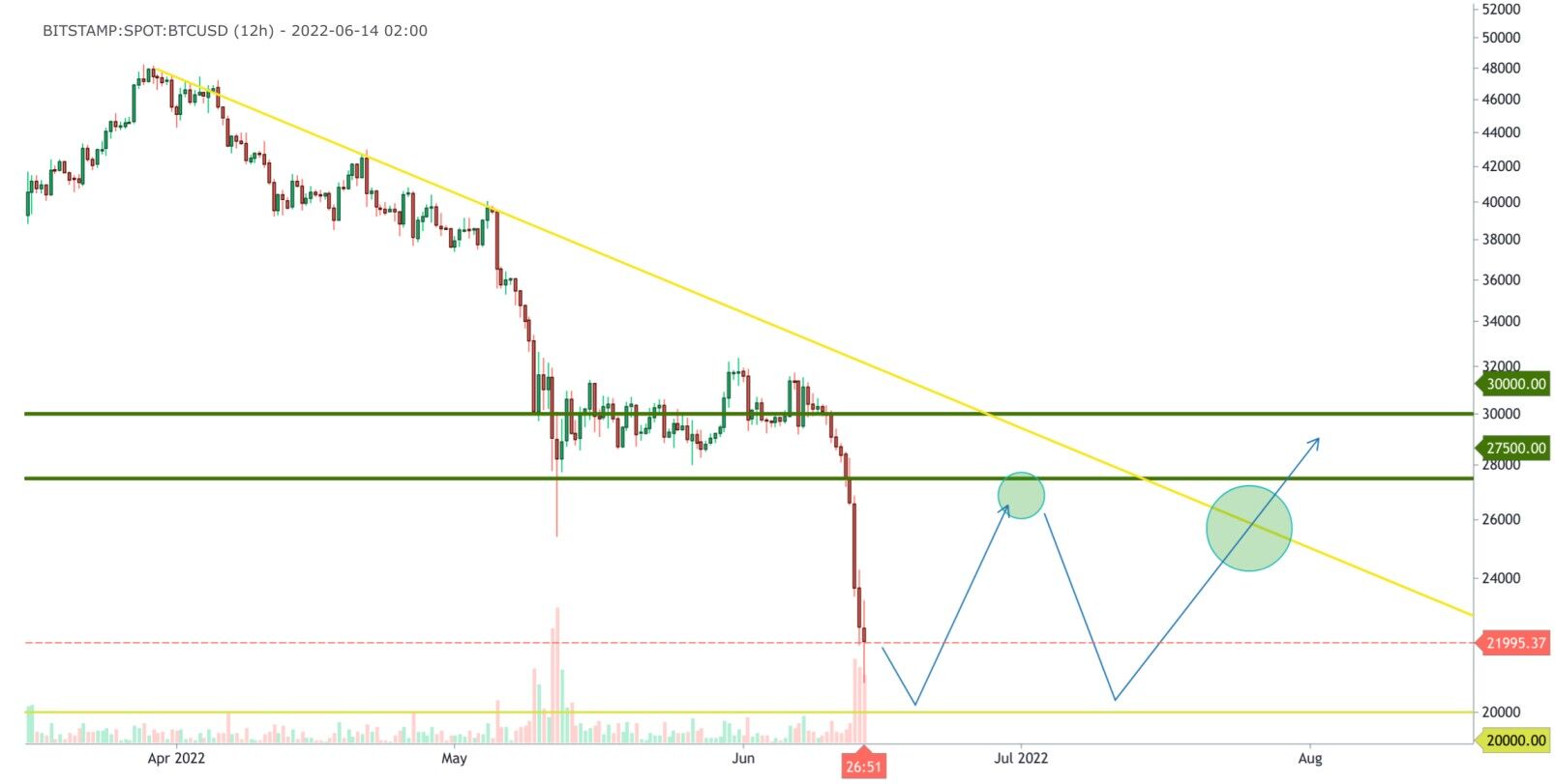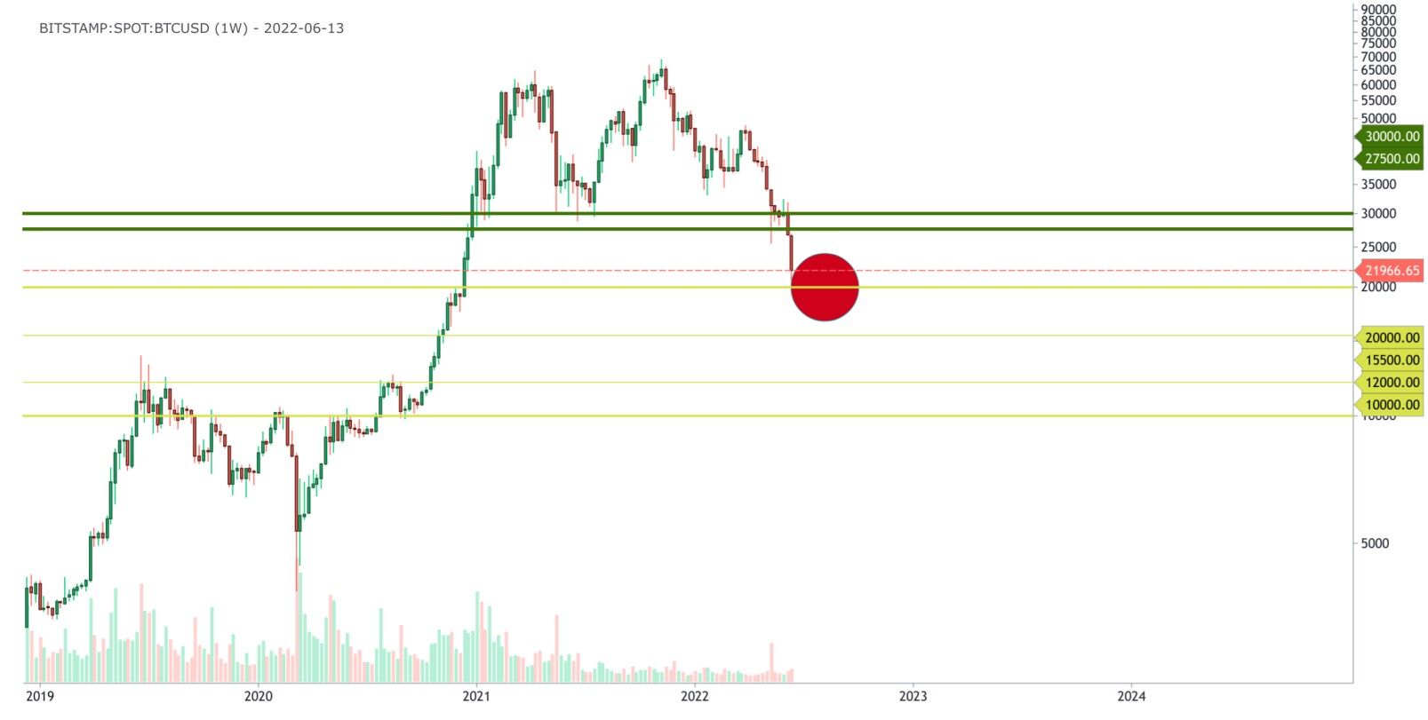 The year 2022 started on a bad note. After Bitcoin reached an all-time high price of $69,500, prices retraced heavily down to $47,000. From there, prices slowly started to fall and went on a bearish trend. In a previous article, we predicted a crash in Bitcoin prices towards $20,000-22,000 as prices managed to breach the strong support of $28,000. This is exactly what happened, as current prices are sitting around $22,300.