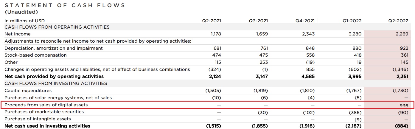 The electric car company’s statement of cash flows shows proceeds from digital asset sales of $936 million. The only other time Tesla’s cash flow statement showed sales of digital assets was in Q1 2021. The sales proceeds amounted to $272 million at the time.
