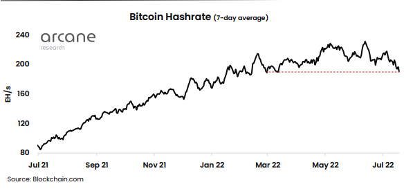 Accordingly, the decline in Bitcoin hashrate has caused a corresponding drop in the mining difficulty. The chart above shows that the 7-day moving average of the hashrate has fallen to levels last seen in March 2022. Over the past month, the value has fallen by more than 26%, from 292.02 EH/s in June to its current 189.84 EH/s