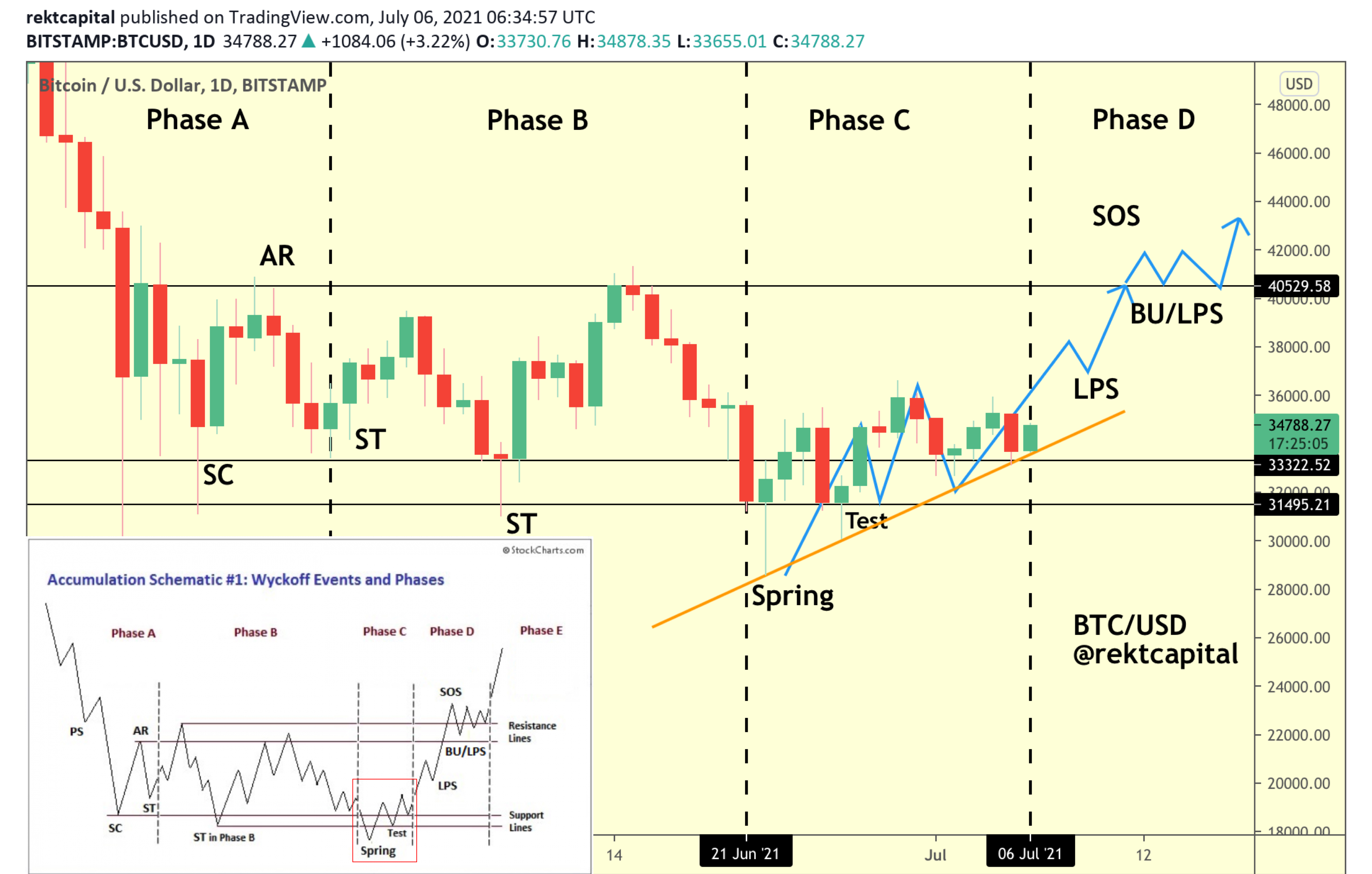 "According to the Wyckoff Accumulation Schematic, $BTC is now in the very final stages of Phase C. $BTC needs to break past $36000 to enter Phase D."