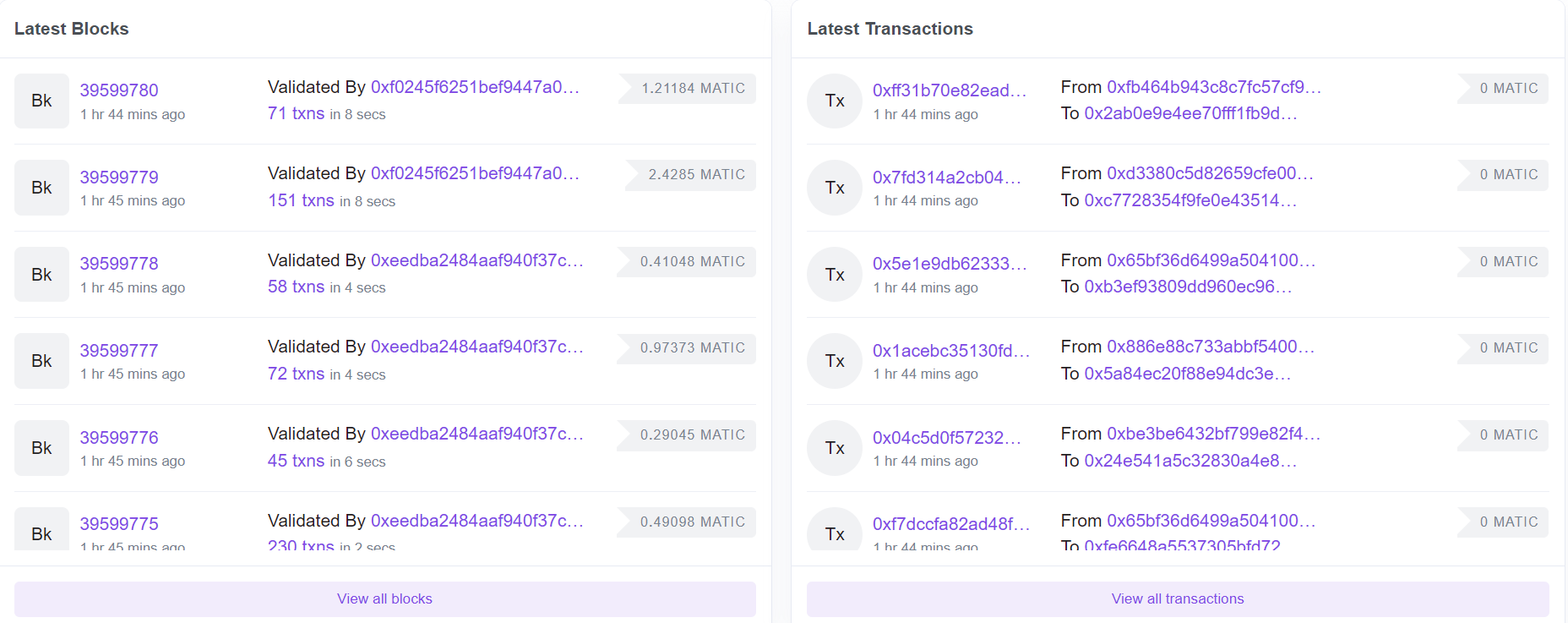 Latest blocks and transactions on Polygon. Source: Polygonscan