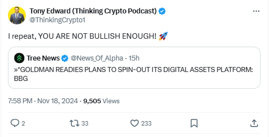 Goldman’s decision comes as financial institutions increasingly adopt crypto-based technology for traditional asset management and the reinvigorated interest among the wealthy individuals to the crypto market, according to Tony Edward, Founder of ThinkCryptoPod.
