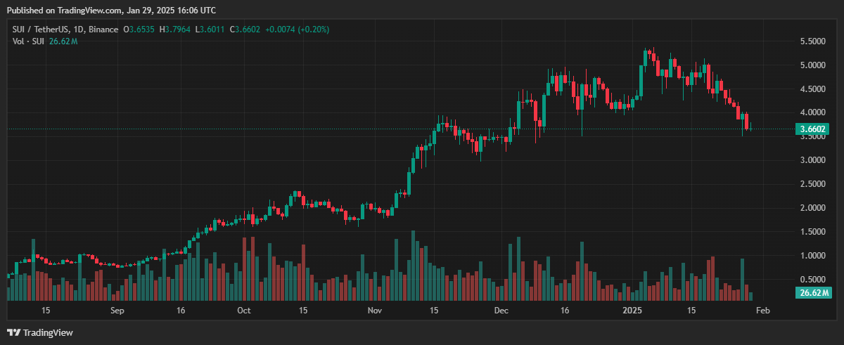 As of the time of this publication, SUI was trading at $3.66, a downtick of over 4% in the last day, according to Coingecko data.
