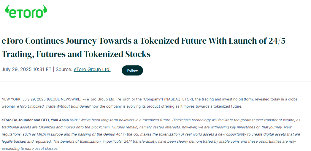 This move is yet another step forward for eToro in the RWA space, building on its 2019 launch of tokenized gold and silver. The broader trend of tokenizing real-world assets has also been accelerating across the industry.