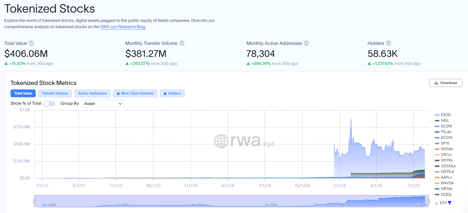 Despite these developments, tokenized stocks are currently unavailable in the United States and other restricted jurisdictions. While their market presence is still modest, accounting for $406 million of the $21.3 billion RWA market according to RWA.xyz, many industry experts see massive growth potential.