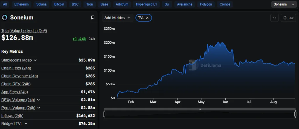 Current figures highlight Soneium’s resilience despite recent consolidation. The network’s total value locked stands at $126.88 million, a 1.46% increase in 24 hours. Its stablecoin market cap remains at $25.89 million, while chain fees and revenue both register $283 daily.