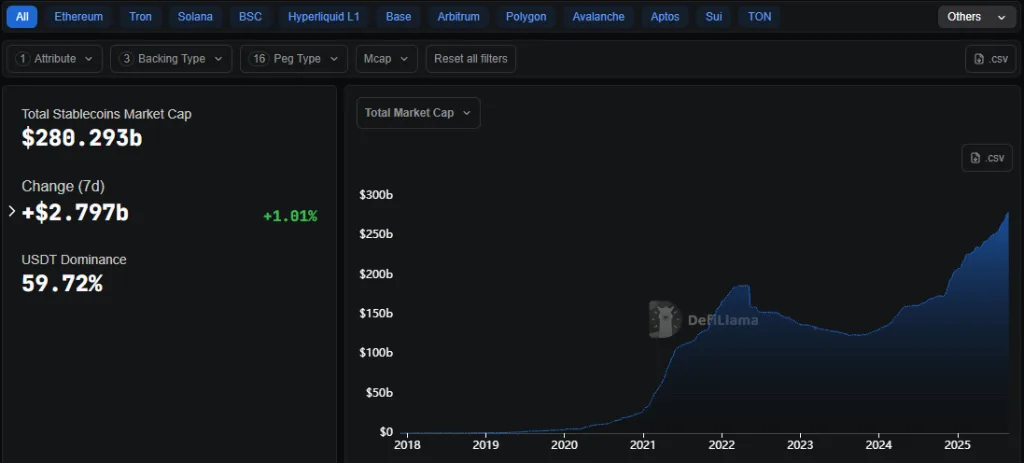 The announcement arrives at a time of strong growth for the stablecoin sector. Data from DefiLlama shows the total stablecoin market capitalization at $280.29 billion. Within the past week, the industry expanded by $2.79 billion, representing a 1.01% increase.