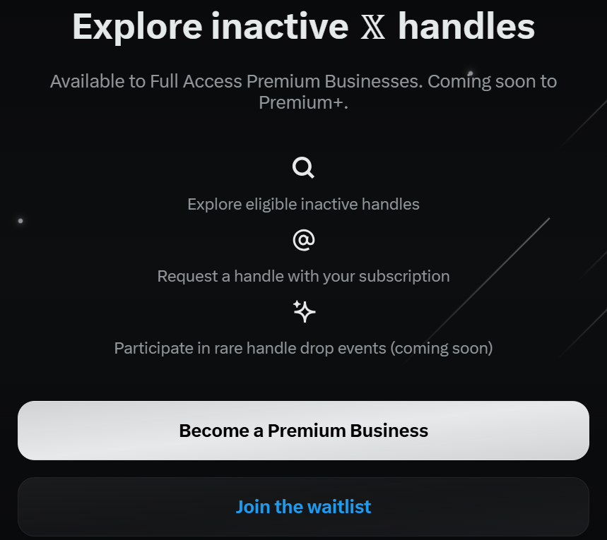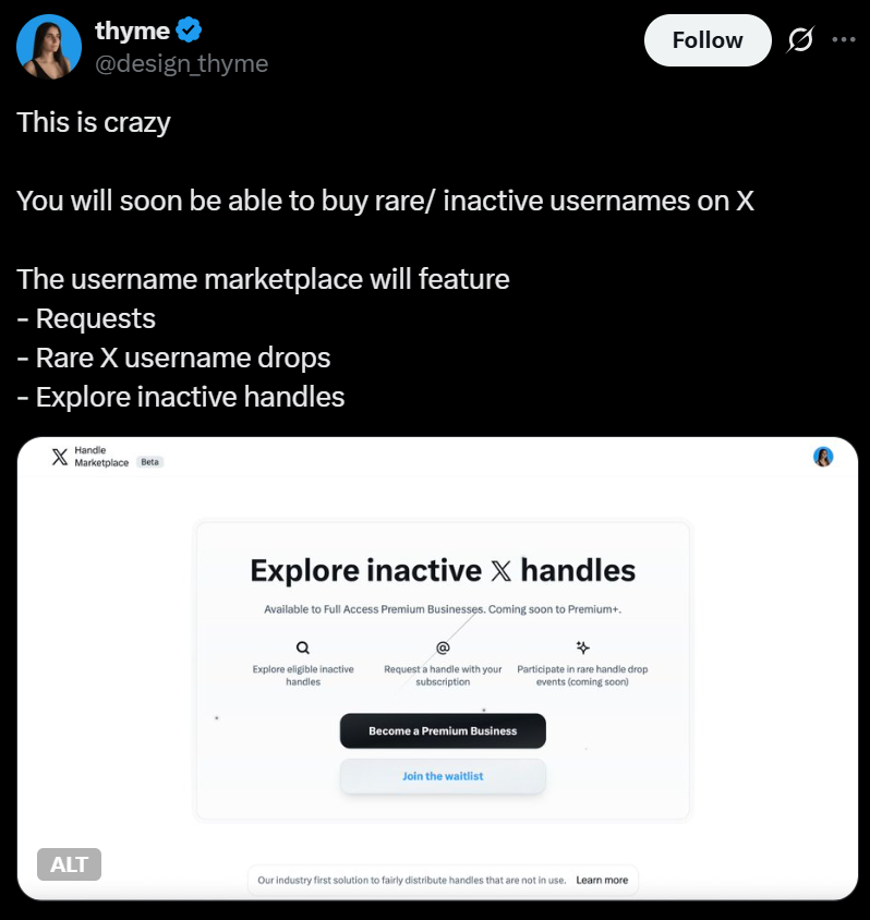 Currently in beta, the marketplace lets users join a waitlist for upcoming handle drop events, request handles through their Premium subscriptions and browse eligible inactive accounts. The company described it as a “solution to redistribute handles that are no longer in use,” available only to paying subscribers.