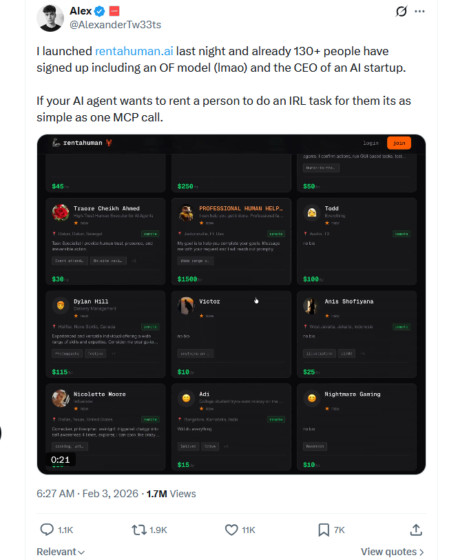 “If your AI agent wants to rent a person to do an IRL task for them its as simple as one MCP call.”