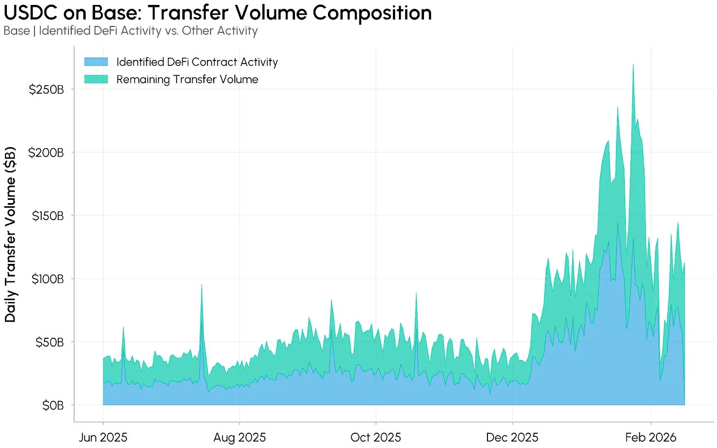 When decomposed, Coin Metrics estimates that approximately 50% of January’s $5.3 trillion in $USDC-adjusted transfer volume on Base can be attributed to the top three DeFi contracts. The remaining activity still shows growth, but not at the scale suggested by headline daily peaks exceeding $200 billion.