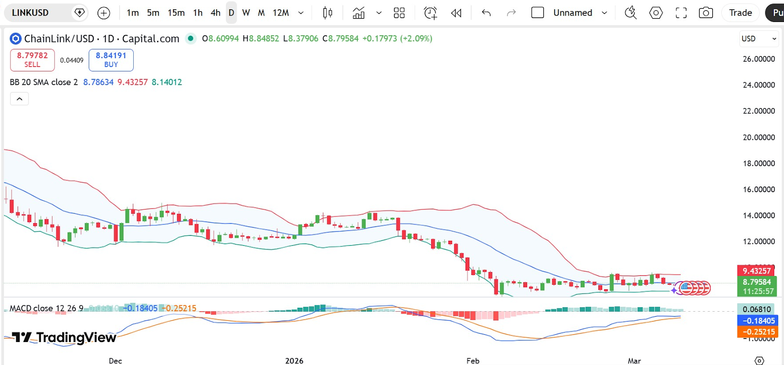 Chainlink price in the meantime moved around the middle Bollinger Band on the daily chart, where the mid-band was near $8.78. A recent rebound in the low prices has seen the altcoin trading near this central position. $LINK price was also below the upper Bollinger Band of about $9.43, keeping that zone in view as the next technical area of the chart.