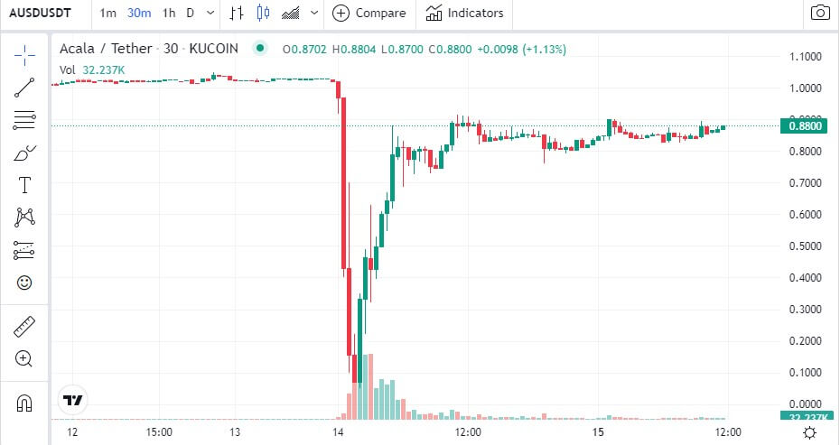 At the time of writing, aUSD is valued at $0.88 per token after it dropped to a low of $0.09. The peg appears to be between $0.90 and $0.80, still some 10% – 20% below its desired peg.