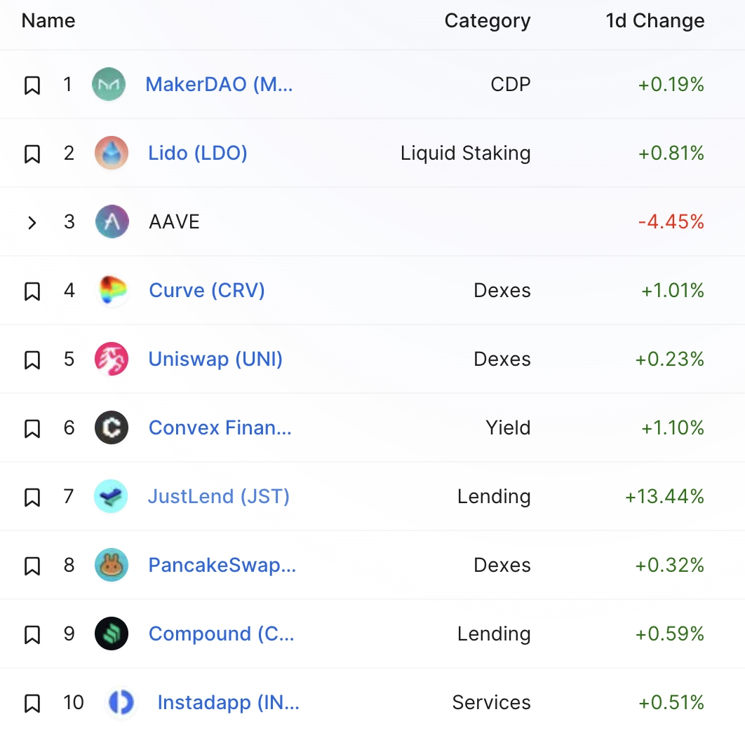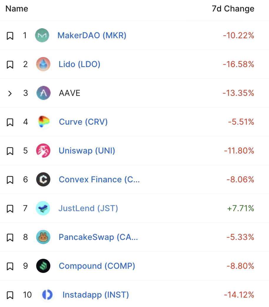 For the top 10 DeFi projects by TVL as a whole, their change over the past week looked like this on Monday morning in Europe (10:00 UTC):