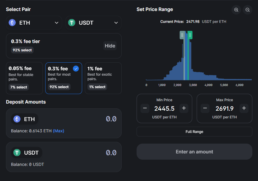 In Uniswap’s latest iteration, liquidity providers are allowed to set specific price parameters within which they’d like to add liquidity. If, for instance, you think that the price of Ethereum will continue to trade between $2,450 and $2,700 as it's done for the past week, then you’d be inclined to add liquidity to this specific range.