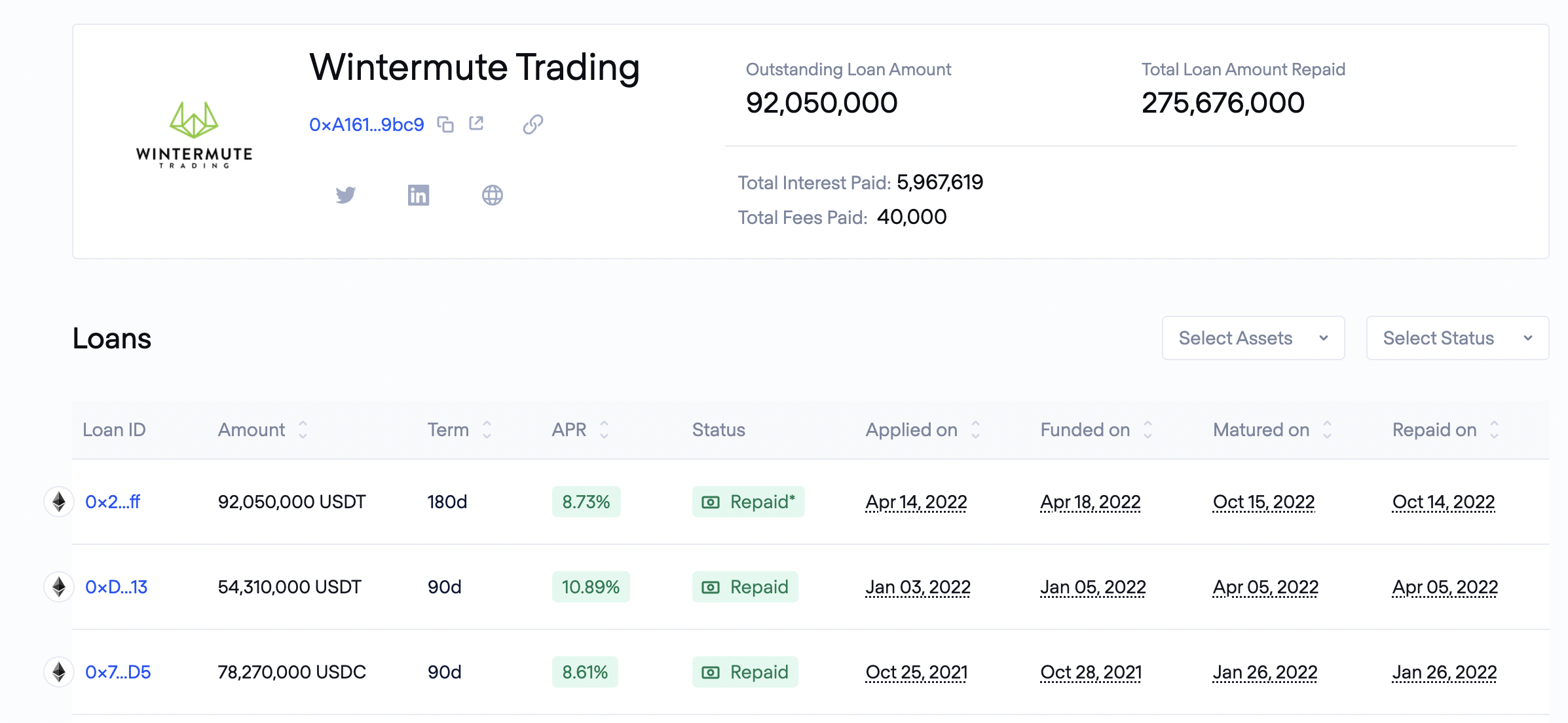 TrueFi's loan dashboard showing Wintermute's loan history (Screenshot)