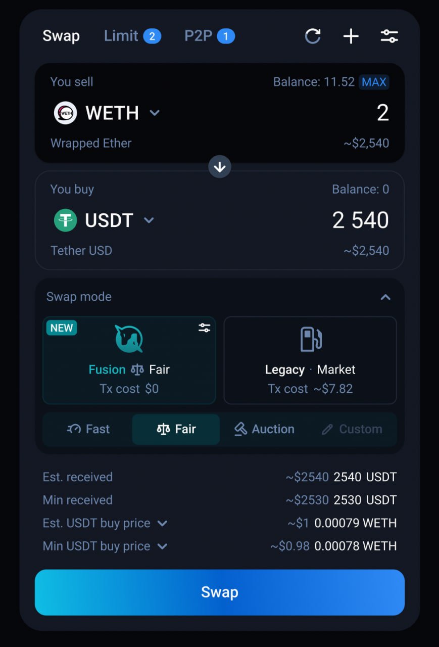 The 1inch Swap Engine powers Fusion mode, which enables users to exchange tokens on various DEXes without paying any network fees, at the most favorable rates.