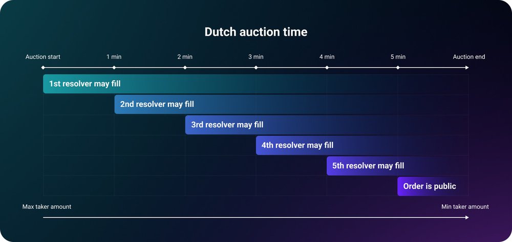 Orders are filled by resolvers – professional market makers who pay applicable gas fees, while profiting from arbitrage trading. To become resolvers, they will need to stake 1INCH tokens and deposit a sufficient balance of 1INCH into the “feebank” contract. At the initial stages, resolvers won’t pay any fees, but, later, the 1inch DAO might introduce a fee for resolvers. Top five resolvers – based on the amount and period of 1INCH staking – will have priority for filling orders.