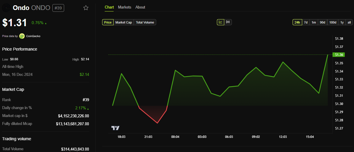 Despite the report, the impact on Ondo Finance’s powering token, ONDO, has been rather muted. BeInCrypto data shows ONDO was trading at $1.31 as of this writing, representing a modest 0.76% surge since Tuesday’s session opened.