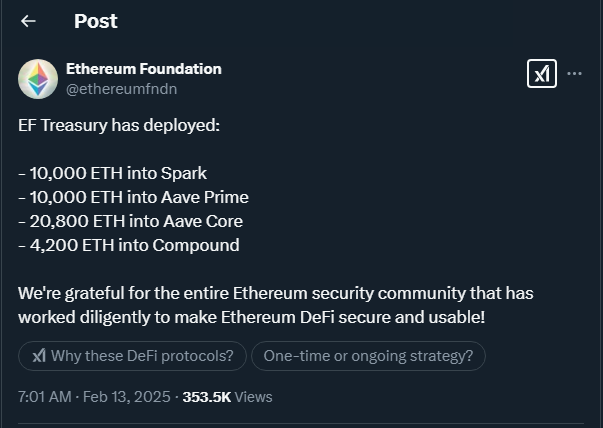 On February 13, the Ethereum Foundation announced a significant backing for decentralized finance (DeFi) apps by deploying 45,000 ETH, roughly equivalent to $120 million, across three major DeFi protocols: Aave, Spark, and Compound. This move addresses community concerns about the Foundation’s reliance on ETH sales to fund its operations.
