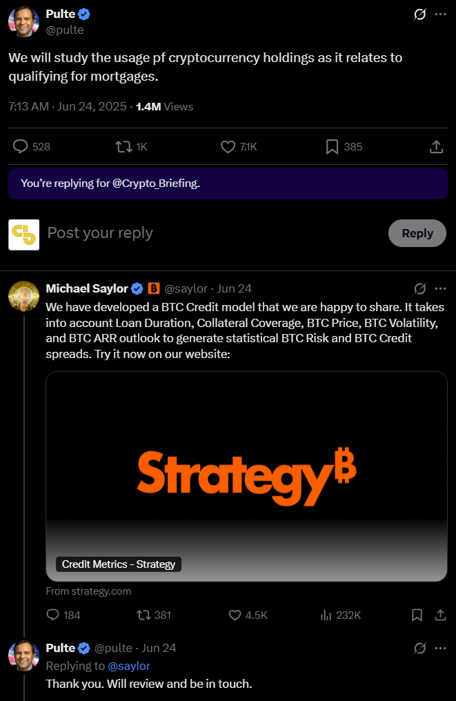 Strategy’s Executive Chairman, Michael Saylor, offered to share the company’s BTC credit model, which was created to evaluate creditworthiness based on Bitcoin assets, which addresses loan duration, collateral, Bitcoin price fluctuations, and risk projections, with Pulte.