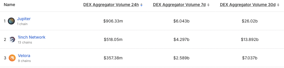 1inch, which launched in 2021, is the second largest DEX aggregator by volume, with $13.9 billion in 30-day volume, only trailing Solana-native Jupiter’s $26 billion.