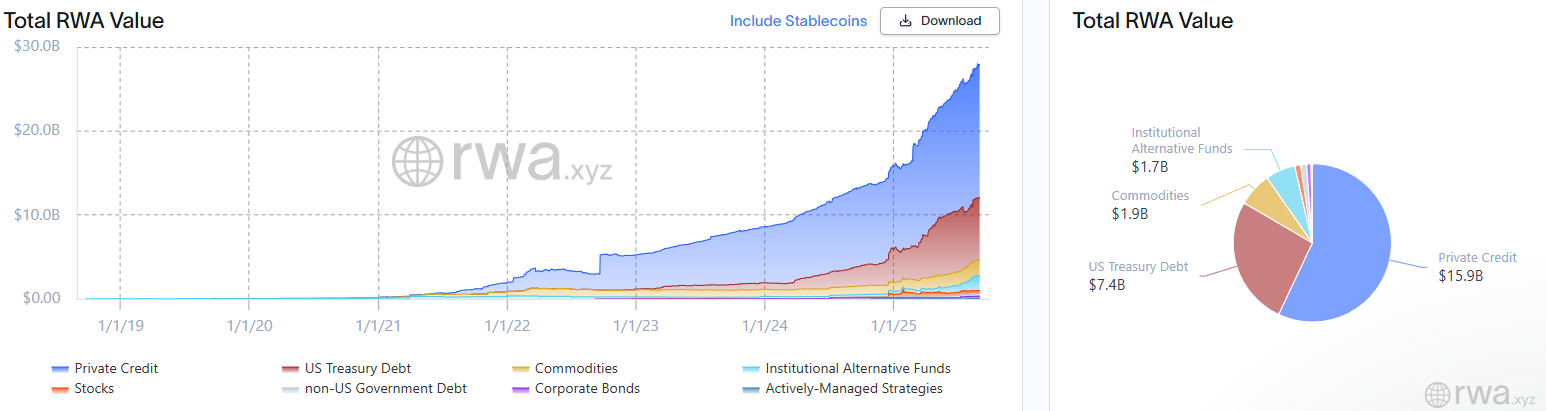 Tokenized financial products, such as private credit and US Treasury bonds, became a focal point of interest for institutions. Tokenized private credit represents the majority, or $15.9 billion, of the total $27.8 billion RWAs onchain, followed by $7.4 billion worth of US Treasuries, according to data from RWA.xyz.