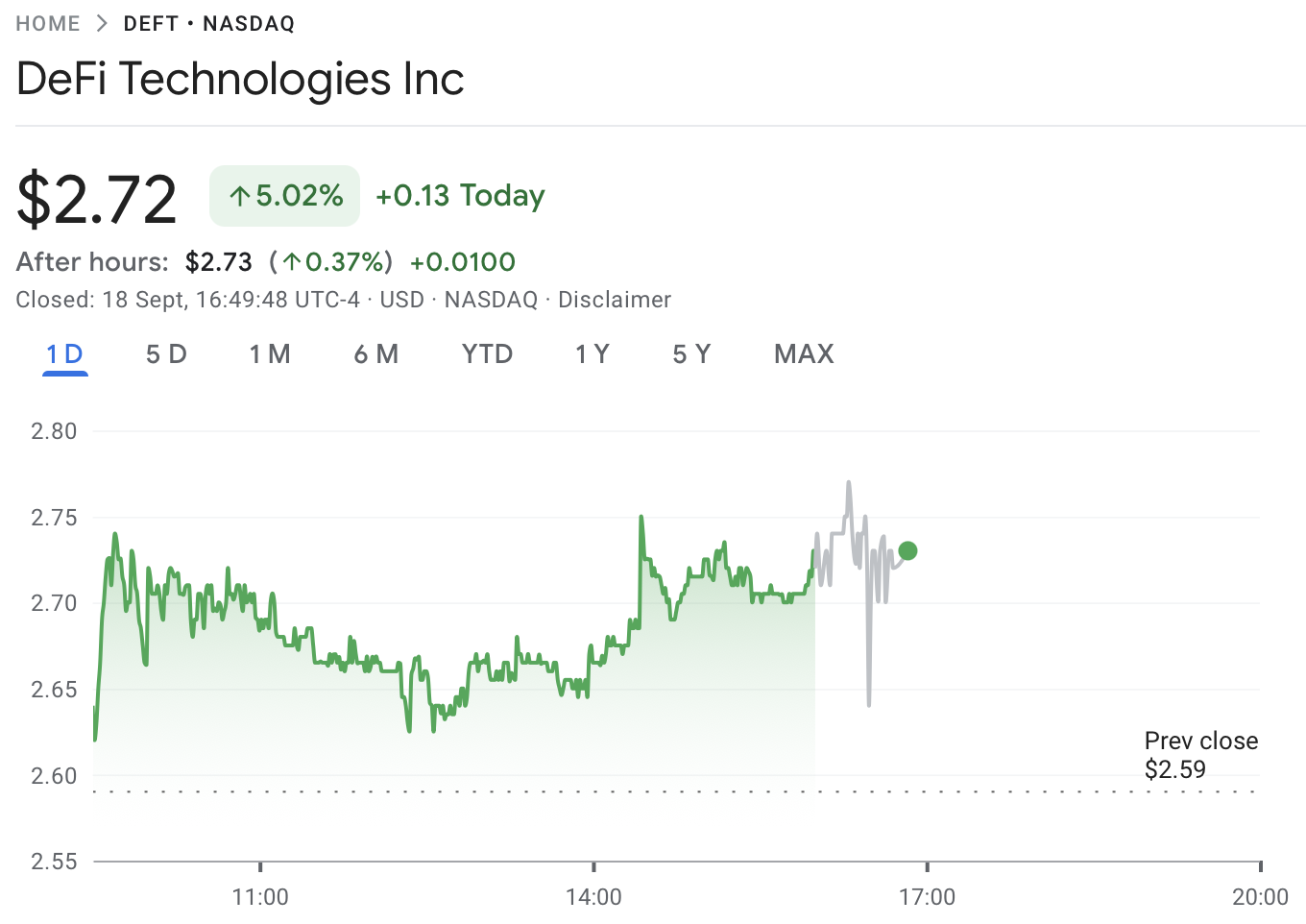 Shares of DeFi Technologies traded on Nasdaq closed up by 5% on the news, according to data from Google Finance.