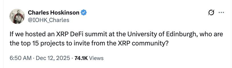 Cardano founder Charles Hoskinson surprised the crypto world by suddenly posing a question to the XRP community: If an XRP-focused DeFi summit were to be held at the University of Edinburgh, which projects should be invited?