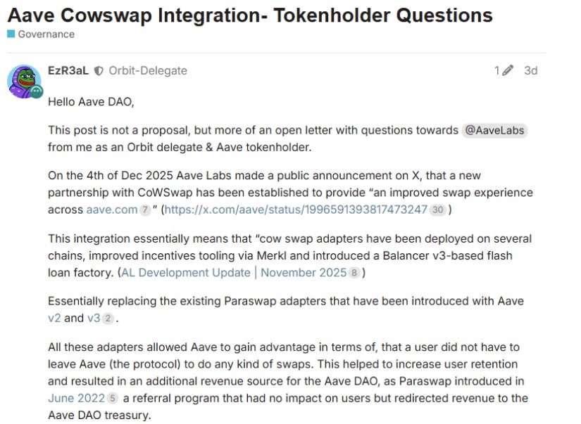 On December 11, 2025, a pseudonymous Aave DAO delegate named EzR3aL posted an open letter in the Aave governance forum questioning where swap fees were going. Through on-chain analysis, EzR3aL traced fees to a private address controlled by Aave Labs rather than the DAO treasury.