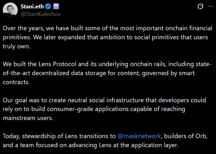 Statements from both Lens and Aave founder Stani Kulechov confirmed the transition. On Tuesday, Kulechov said in an X post that Aave’s role will narrow down to technical advisory support as it refocuses on DeFi.