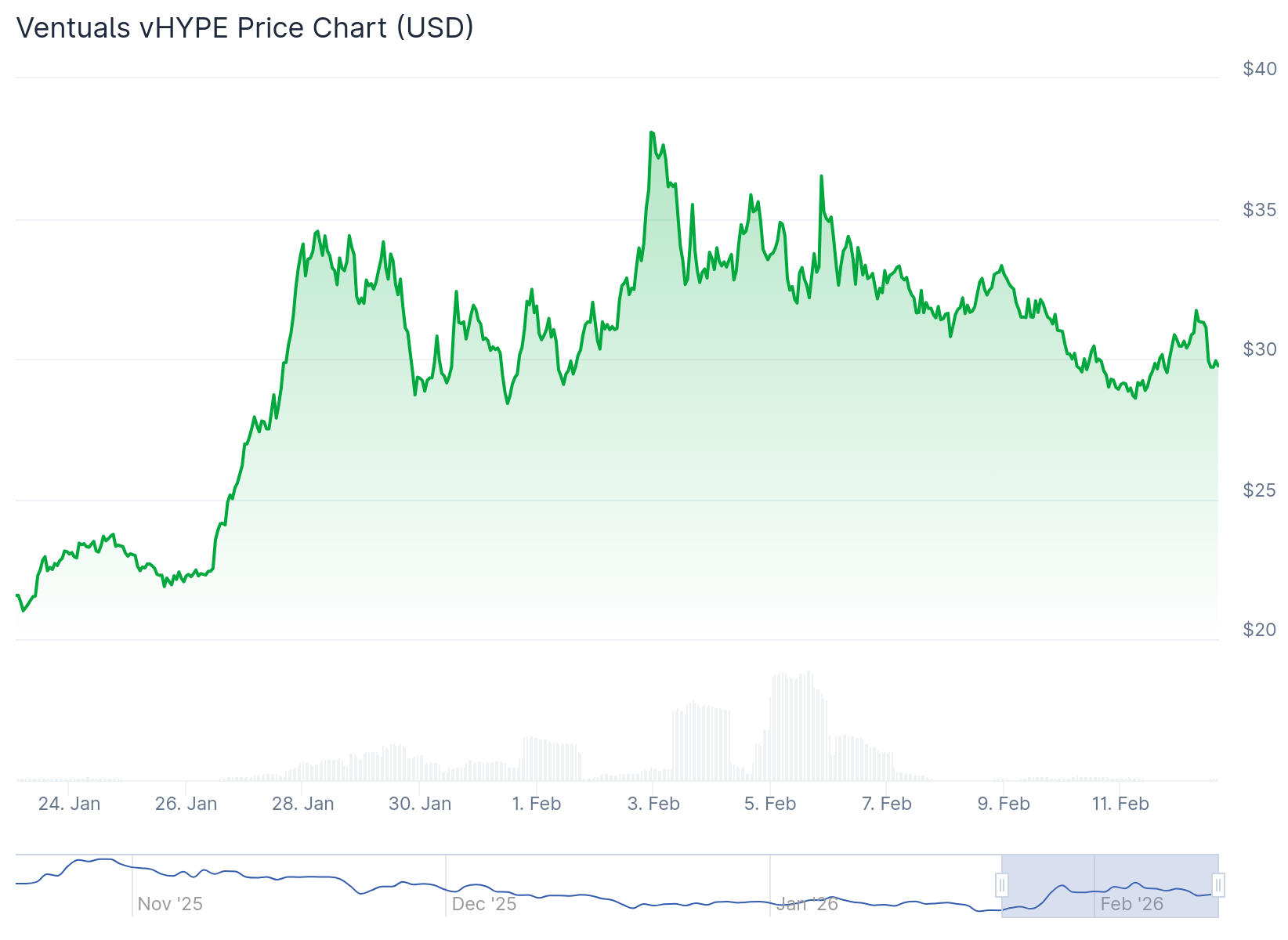 Alongside the surge in activity, Ventuals’ liquid staking token vHYPE, which represents a claim on the underlying HYPE, Hyperliquid’s native token, rose about 20% to $30, according to CoinGecko data.