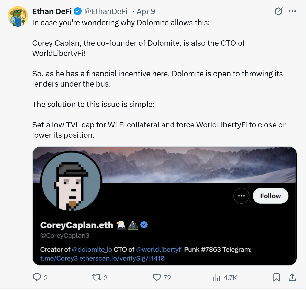“$WLFI has almost a $10 billion FDV, but it is not an extremely liquid asset,” one user wrote on X. “So imagine what would happen if 5% of $WLFI's total supply would suddenly need to be sold to liquidate the position,” he added.