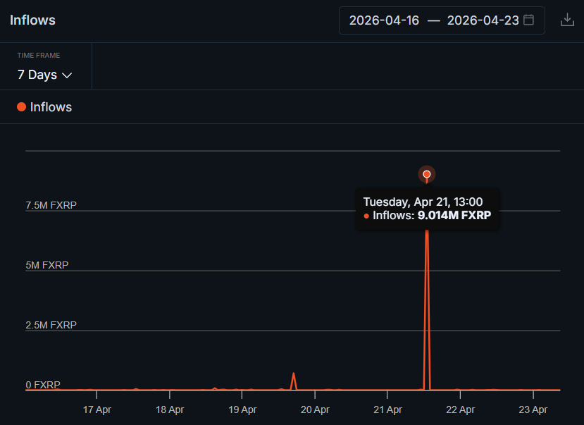 On-chain data confirms the recent milestone. Specifically, as of April 21 at 13:00, Firelight recorded 9.014 million FXRP in inflows, with the single 8 million $XRP stake making up most of that amount. This became the largest hourly inflow in over a month and the second highest recorded this year.