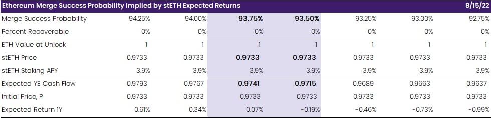 With stETH changing hands at 0.973 ETH at press time, the price implies only a 93.5-93.75% chance of the Merge going through smoothly and on time, Enigma estimates. This percentage is lower than what many market watchers are expecting because all the dress rehearsals went well.